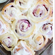 A sweet and sticky raspberry roll covered with a cream cheese frosting